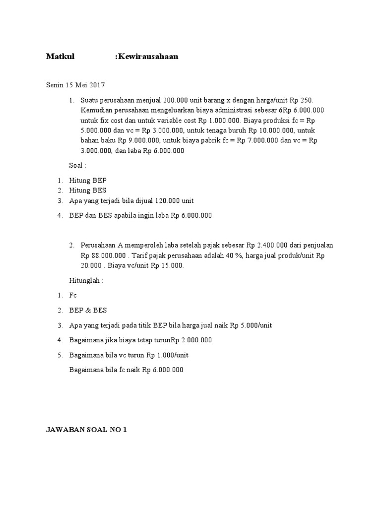 9 Contoh Soal Bep Dan Pembahasannya. Termasuk contoh soal bep kewirausahaan dan sejenisnya. Nah mengenai benar atau salahnya saya sendiri belum tahu. Cara menghitung beprumus bepmenghitung bepcontoh soal bepperhitungan bepcara.