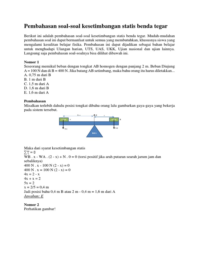 Jika panjang batang 2 sebagai keterangan wt = berat tangga dan wo = berat orang. Pada batang ab yang massanya diabaikan, digantungkan sebuah balok bermassa 10 kg. Dan yang dimaksud dengan kesetimbangan benda tegar adalah kondisi dimana suatu benda berada dalam.